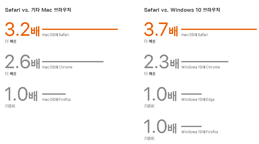거기다 강력한 성능도 가지고 있습니다. 정확하게 어떤 기준으로 확인된 데이터인지는 모르겠지만 사파리 브라우저홈페이지에는 타 웹브라우저와 비교해둔 자료가 있는데요. 윈도우에서 제공하는 Edge와 비교해도 월등히 좋다고 되어 있군요.