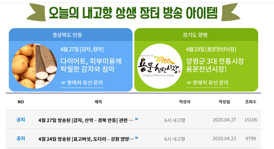 직접 들어가보시면 그날그날 방송된 부분에 대해서 게시판에 정보들이 등장합니다. 게시판 글의 조회수만 보더라도 많은 분들이 이곳을 이용해서 거래를 한다는 것을 아시겠죠? 여러분들도 한번 상생장터 홈페이지를 이용해보시기 바랍니다.